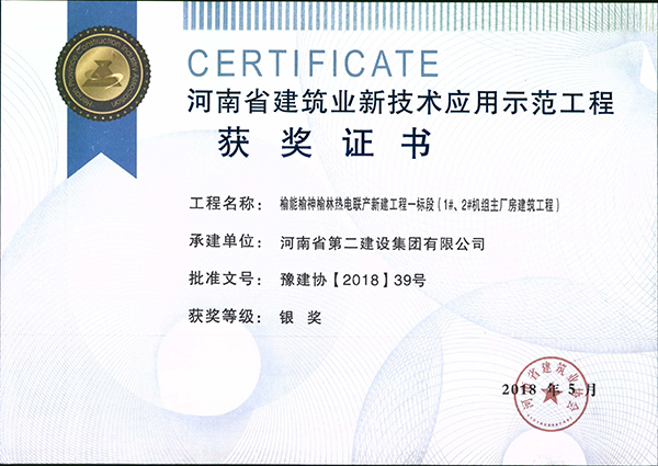 榆能榆神榆林熱電聯産擴建工程榮獲河南省建築業新技術應用示範工程銀獎