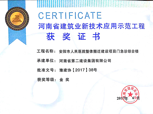 安陽市人民醫院整體搬遷建設項目門急診綜合樓工程榮獲河南省新技術應用示範工程金獎