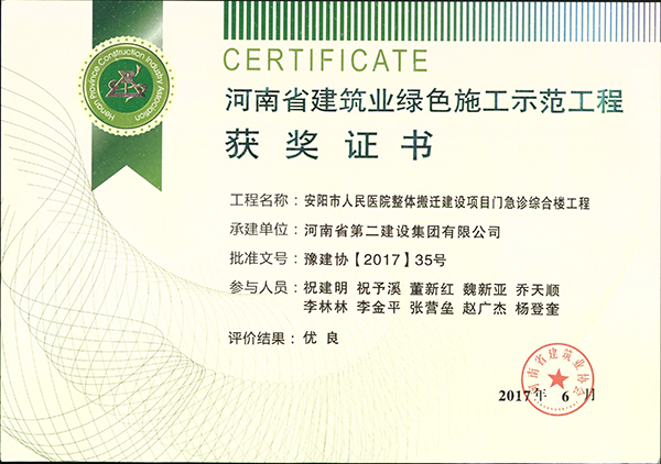 安陽市人民醫院整體搬遷建設項目門急診綜合樓工程榮獲河南省建築業綠色施工示範工程